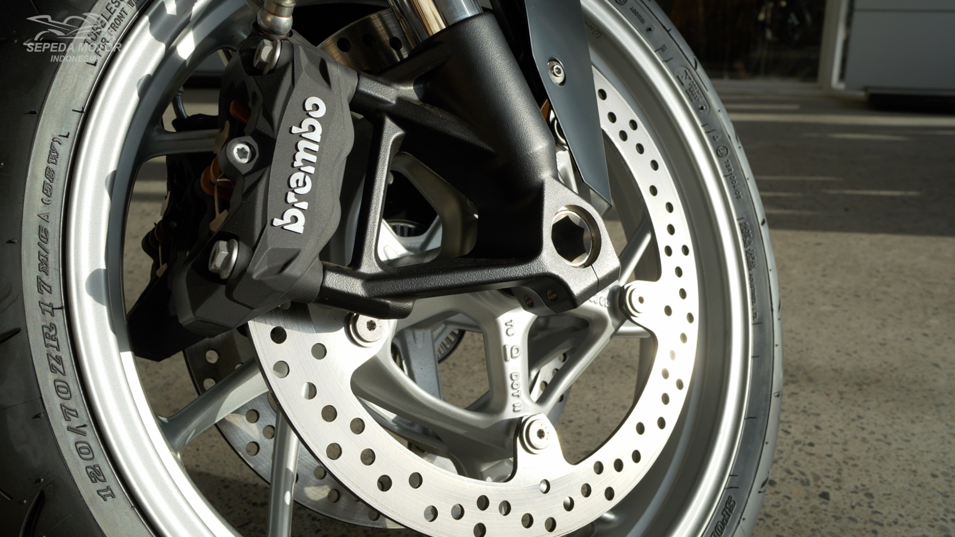 Lanjut pada tampilan bawah, ban berukuran besar lengkap dengan suspensi Upside Down melengkapi motor ini bersama dual disc brake di sisi depan dan belakang. Selain itu, naked bike ini semakin terlihat berisi dan gahar berkat velg yang tampak lebih lebar.