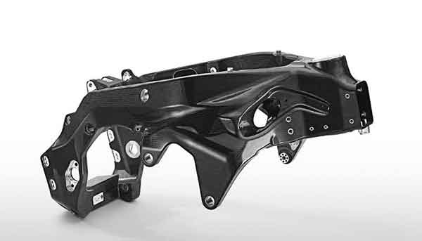 Frame: Carbon monocoque RTM frame with steering head angle and swinging-arm pivot adjustment, load- bearing engine