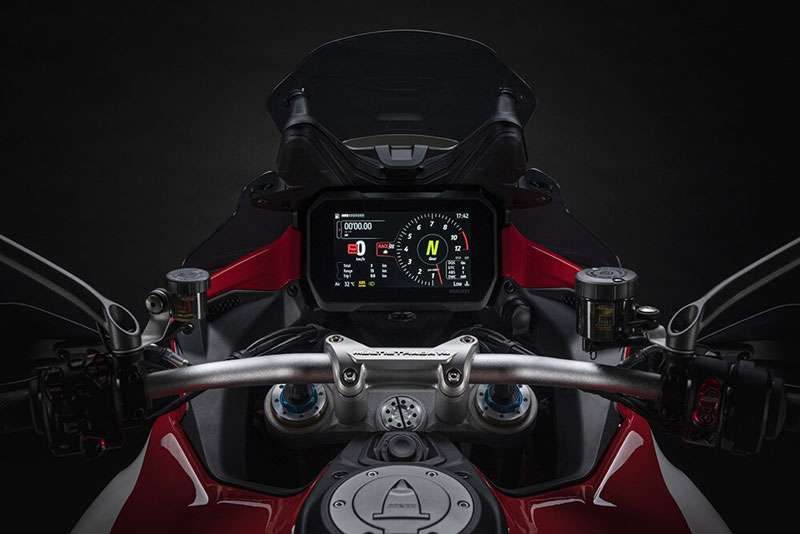 Dashboard TFT 6,5” menjadi standar pada Multistrada V4 Pikes Peak, memungkinkan pengguna untuk melihat navigator peta berkat sistem canggih Ducati Connect. Pengguna bisa mencerminkan smartphone-nya ke layar.