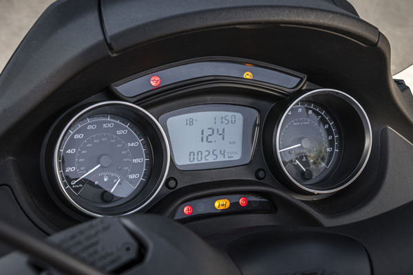 Sebelas lampu pada panel instrumen mewakili fungsi lampu jauh, penggunaan indikator, cadangan bahan bakar, tekanan oli, peringatan (injeksi), immobilizer, ABS, ASR, dan empat lampu darurat. Di bagian tengah, tepat di bawah layar, serangkaian 4 lampu peringatan menunjukkan: pengoperasian lampu DRL; roll lock diaktifkan; rem parkir diaktifkan dan pengoperasian Piaggio MIA. Tombol tekan di bawah setang digunakan untuk membuka sadel dan mematikan ASR.