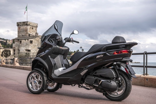 Piaggio MP3 400 hpe memiliki teknologi eksklusif tiga-roda Piaggio: sistem suspensi segiempat berartikulasi depan dan sepasang roda depan.