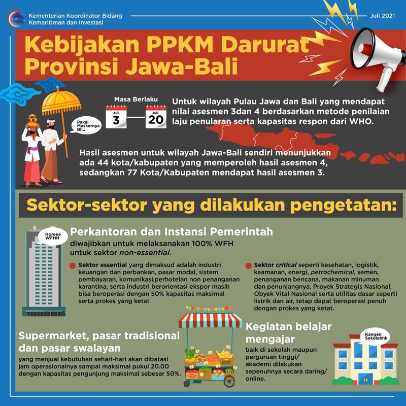 - Sektor-sektor kritikal atau penting seperti keamanan, makanan/minuman, energi, penanganan bencana, kelistrikan dan lain-lain tetap beroperasi dengan Prokes ketat.
