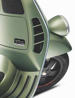 Ditandai dengan bodi yang besar berbahan baja dan tampilan yang elegan, skuter ini hadir dalam warna hijau matte. Angka/nomor 6 yang dicetak sebagai pengganti nomor balap memberikan kesan sporti. Warna nomor 6 yang hitam putih diambil langsung dari warna Vespa yang digunakan oleh Squadra Corse yang legendaris di tahun 50-an.