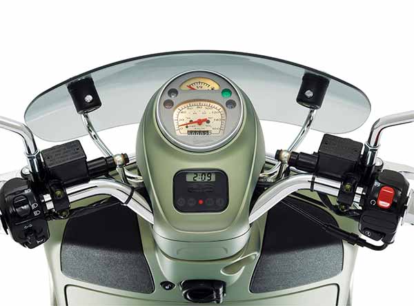 Panel instrumen bergaya retro yang berisi speedometer analog berlatar belakang putih juga mencirikan gaya asli Vespa. Namun sejumlah teknologi terkini telah diintegrasikan guna menyediakan berbagai informasi berguna bagi pengendara. Winshield yang melindungi panel instrumen membuat Sei Giorni baru ini sedikit berbeda dengan versi aslinya.